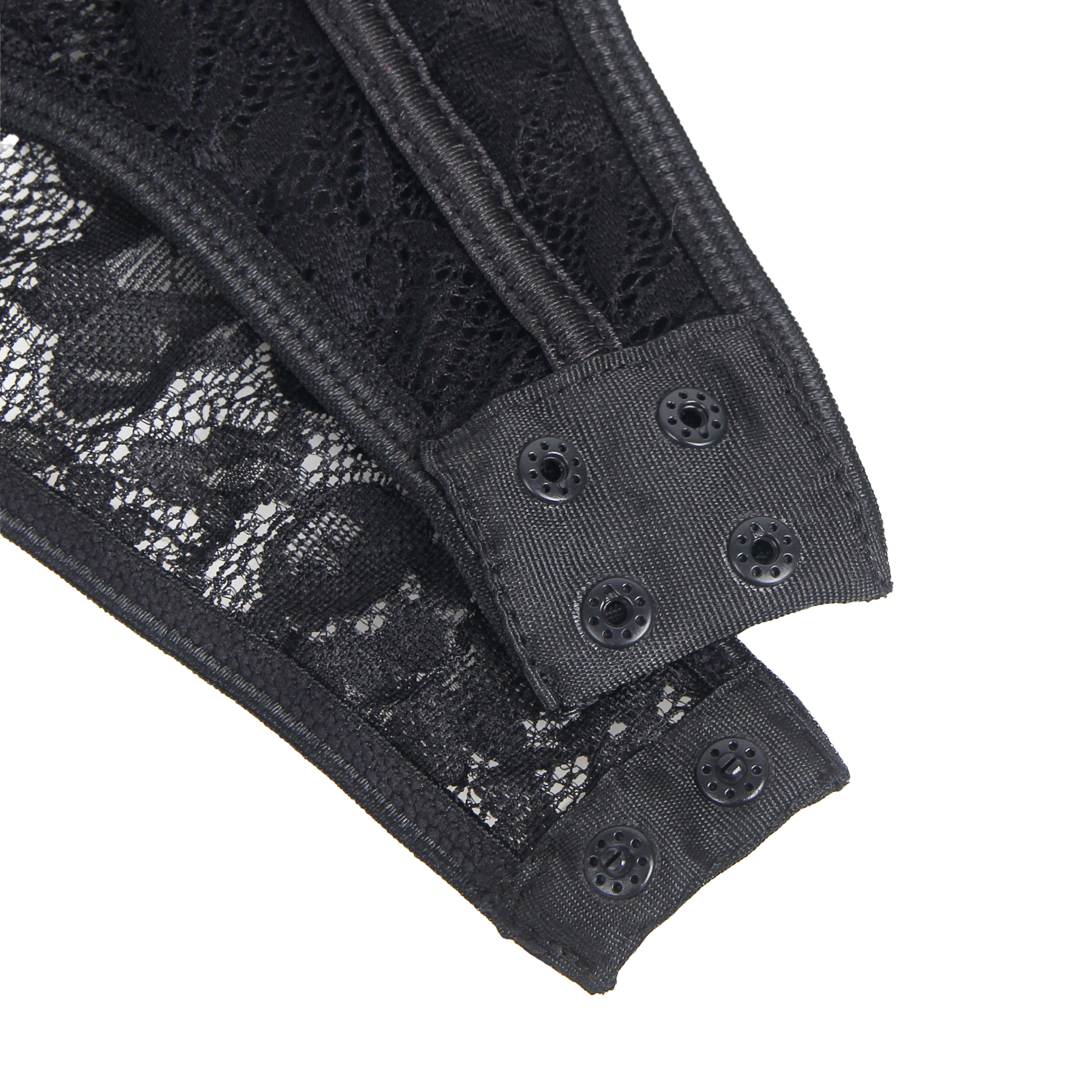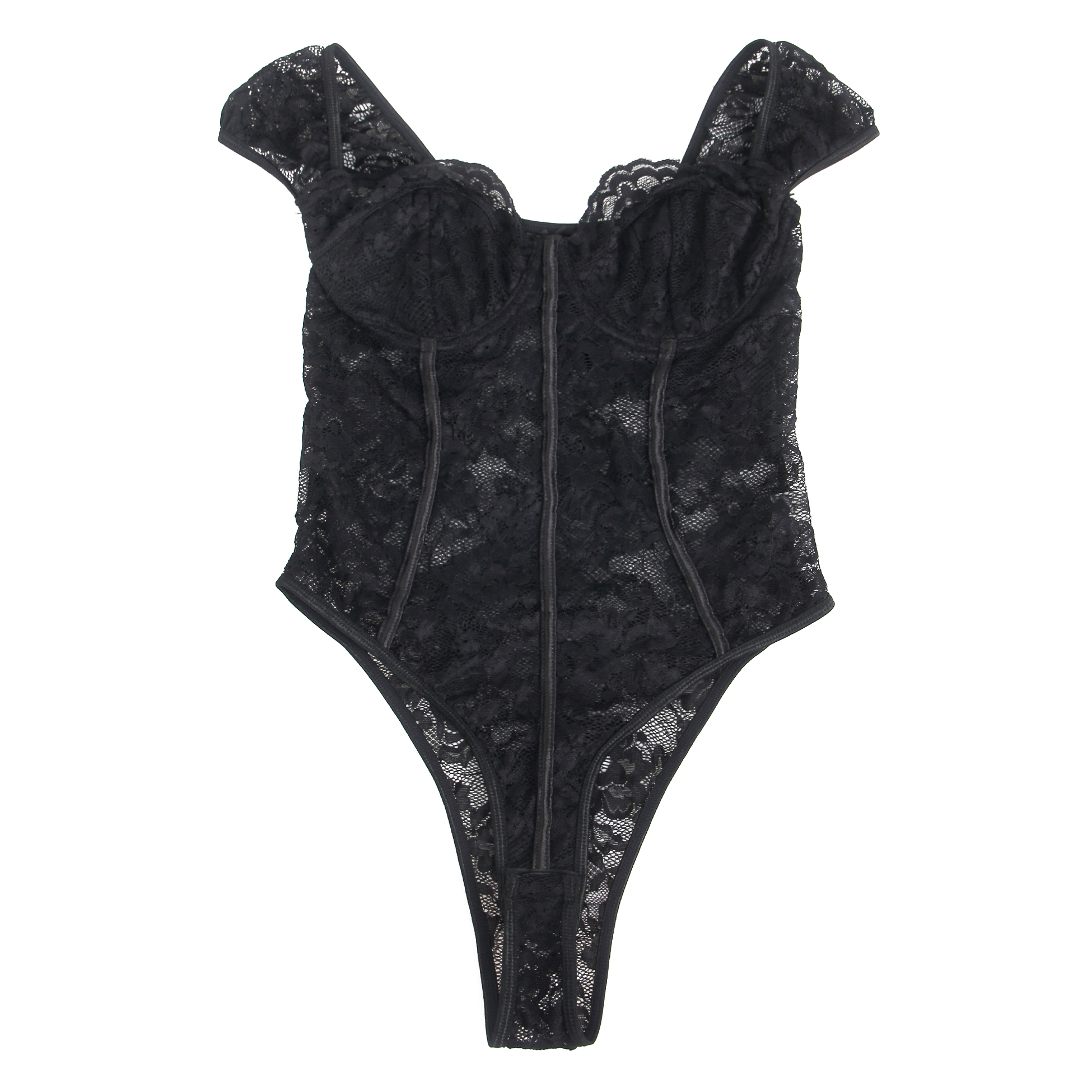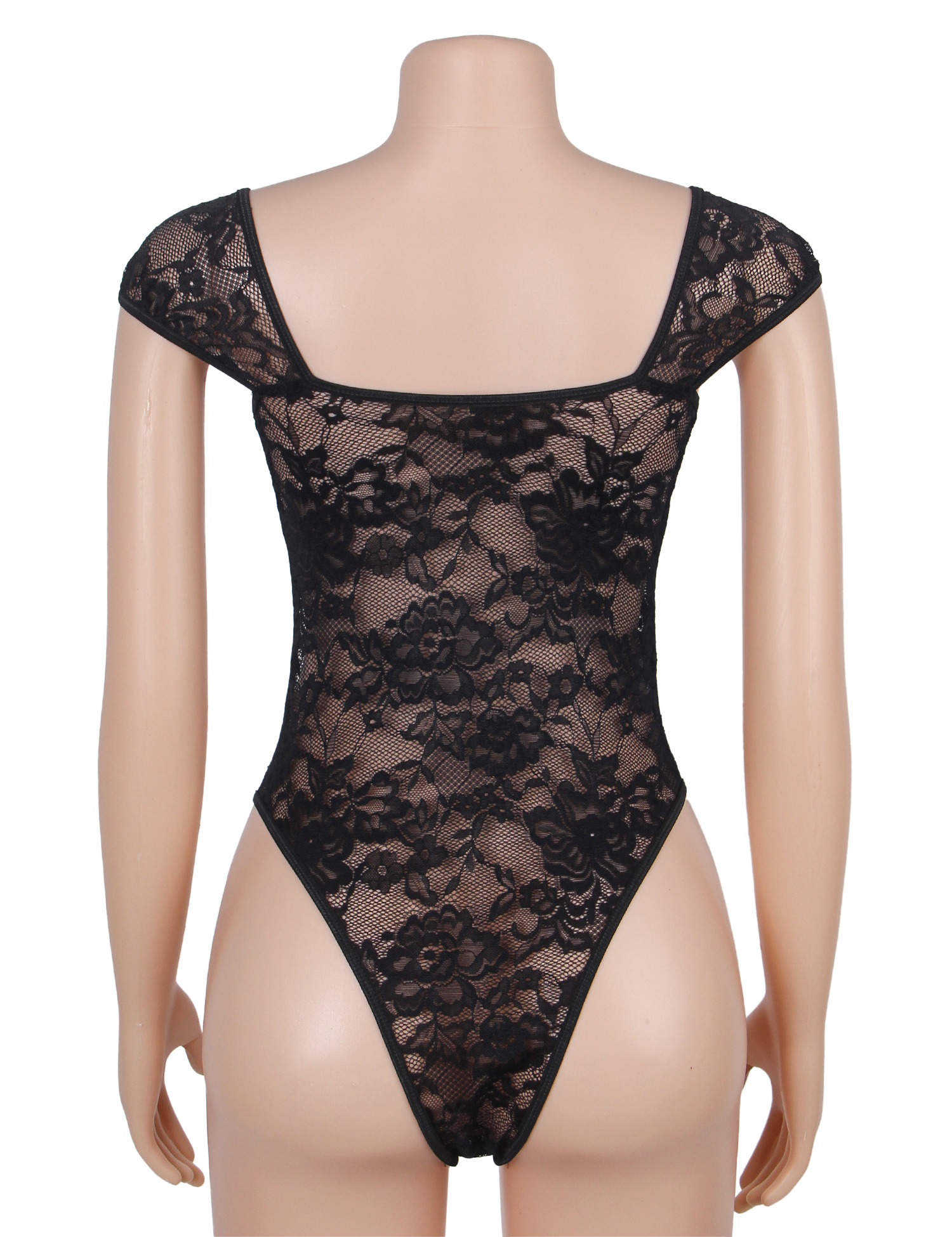 Black Lace Square Neck Short Sleeves Open Crotch Bodysuit